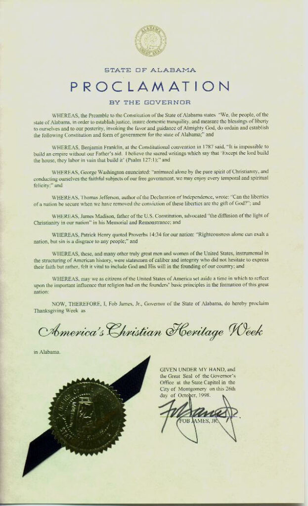 NOW, THEREFORE, I, Bob James, Jr., Governor of the State of Alabama, do hereby proclaim Thanksgiving Week as