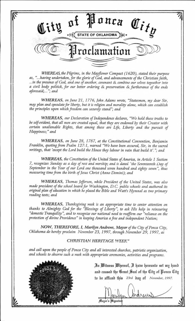 Now, therefore, I, Frank Keating, Governor of the State of Oklahoma, do hereby proclaim the week of November 23-29, 1997 (Thanksgiving Week) as “America’s Christian Heritage Week” in the State of Oklahoma and I encourage all citizens to acknowledge, appreciate, and celebrate, each in his or her own way, America’s Christian Heritage.