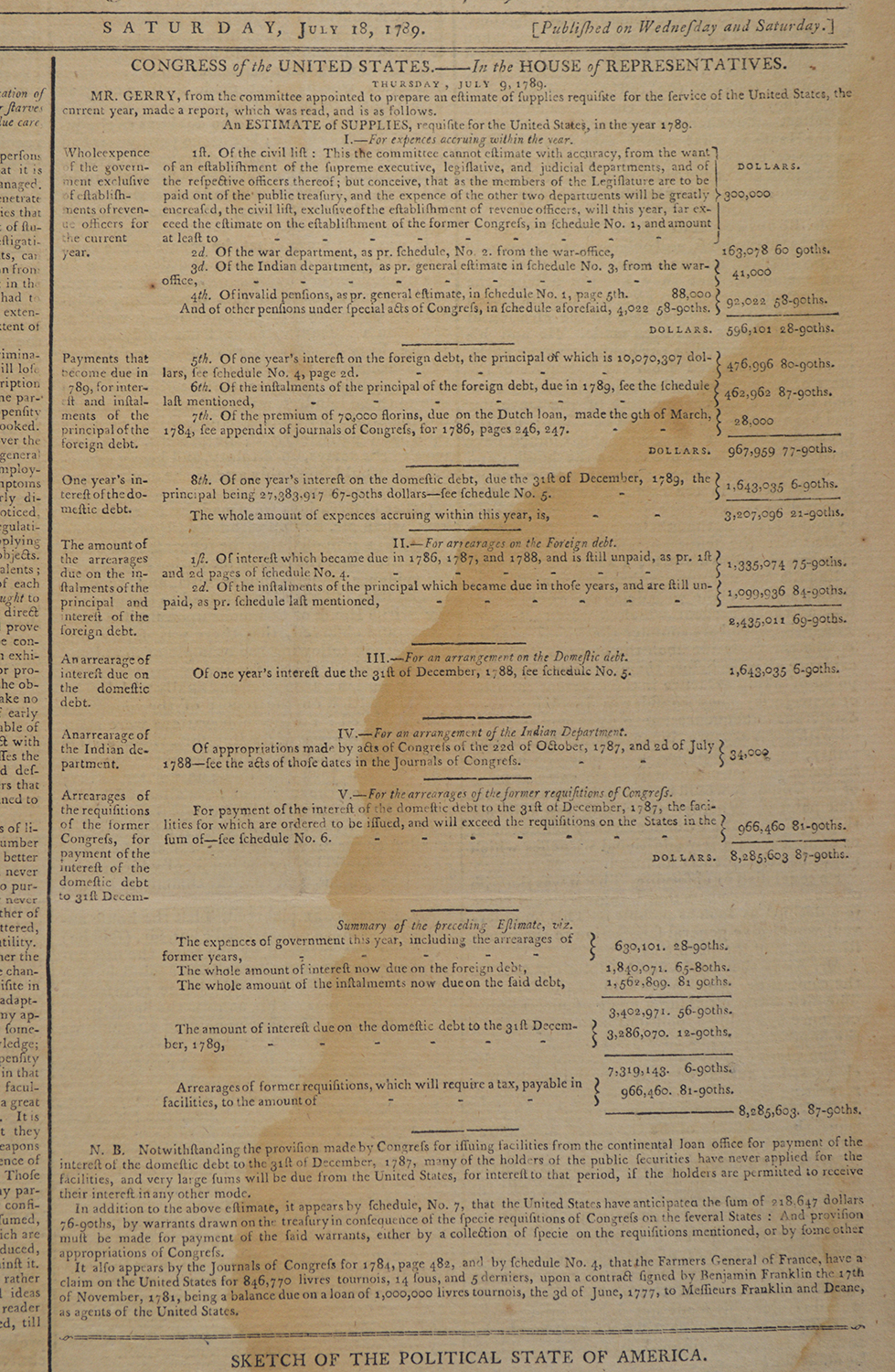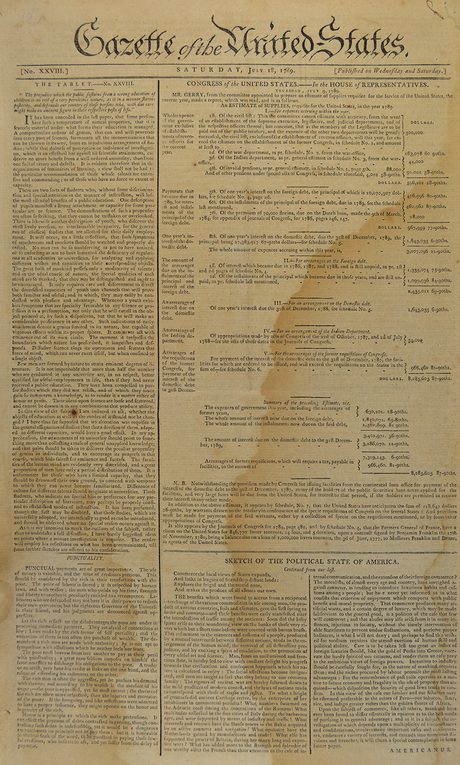 Below is an interesting item from WallBuilders’ collection — the first federal budget of the United States, dated July 9, 1789. This budget takes up only about 1/2 page of the newspaper it’s printed in, The Gazette of the United States (July 18, 1789).