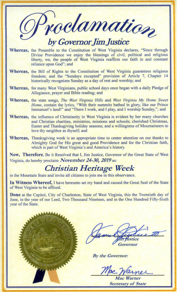 WHEREAS, Thanksgiving week is an appropriate time to center attention on, and to teach children of our Christian Heritage, which is foundational to the institutions, values, and vision of our nation, and to thank Almighty God for His great and good Providence in the formation of our state and nation.