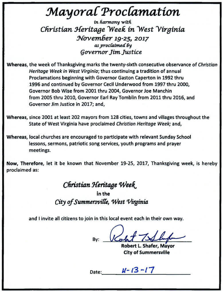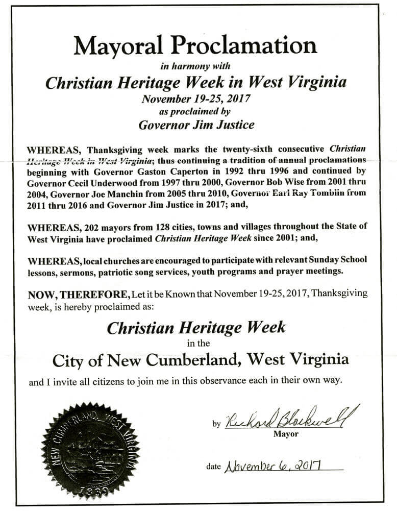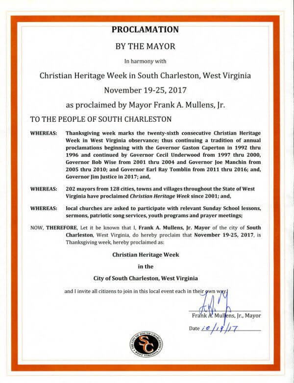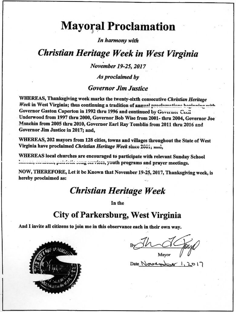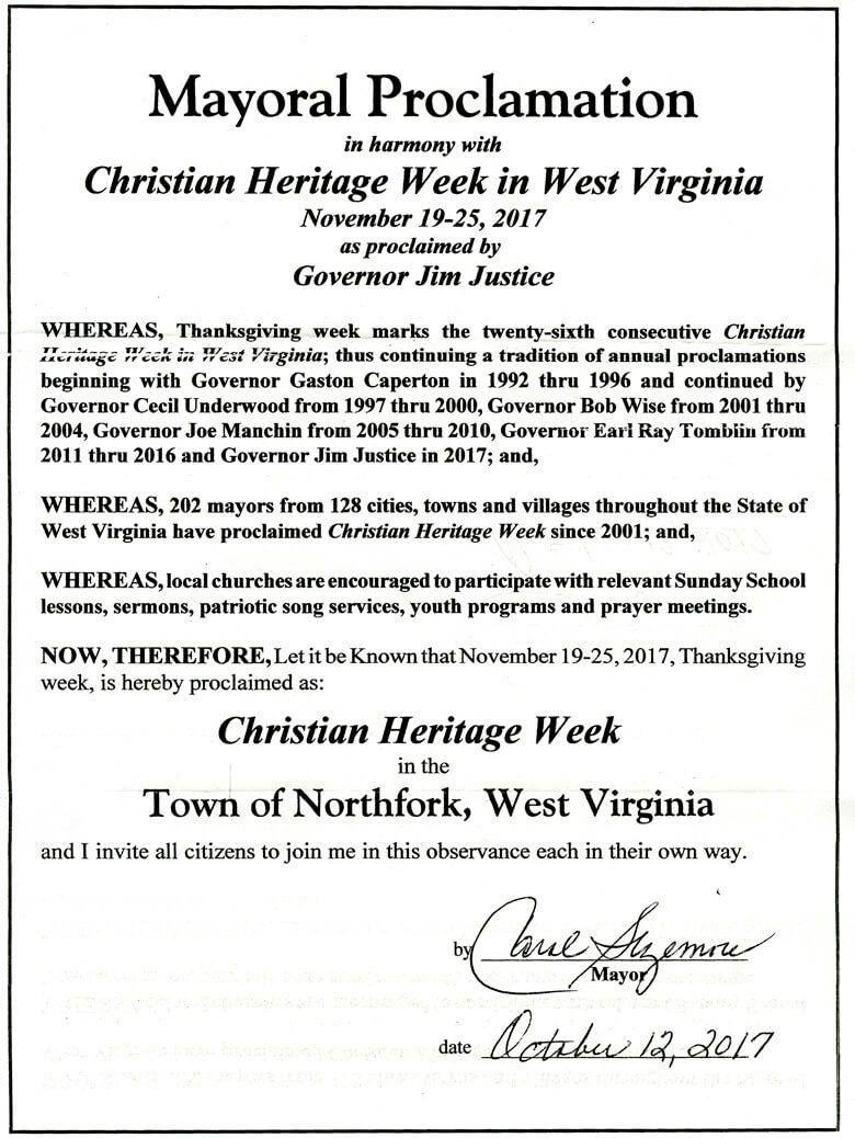 WHEREAS, Thanksgiving Week marks the twenty-sixth consecutive Christian Heritage Week in West Virginia; thus continuing a tradition of annual proclamations beginning with Governor Gaston Caperton in 1992 thru 1996 and continued by Governor Cecil Underwood from 1997 thru 2000, Governor Bob Wise from 2001 thru 2004, Governor Joe Manchin from 2005 thru 2010, and Governor Earl Ray Tomblin from 2011 thru 2016 and Governor Jim Justice in 2017; and,