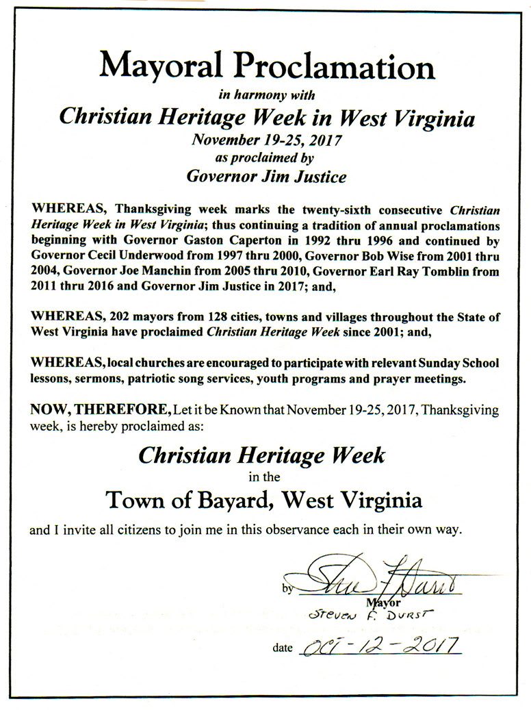 WHEREAS, 202 mayors from 128 cities, towns and villages throughout the State of West Virginia have proclaimed Christian Heritage Week since 2001; and,