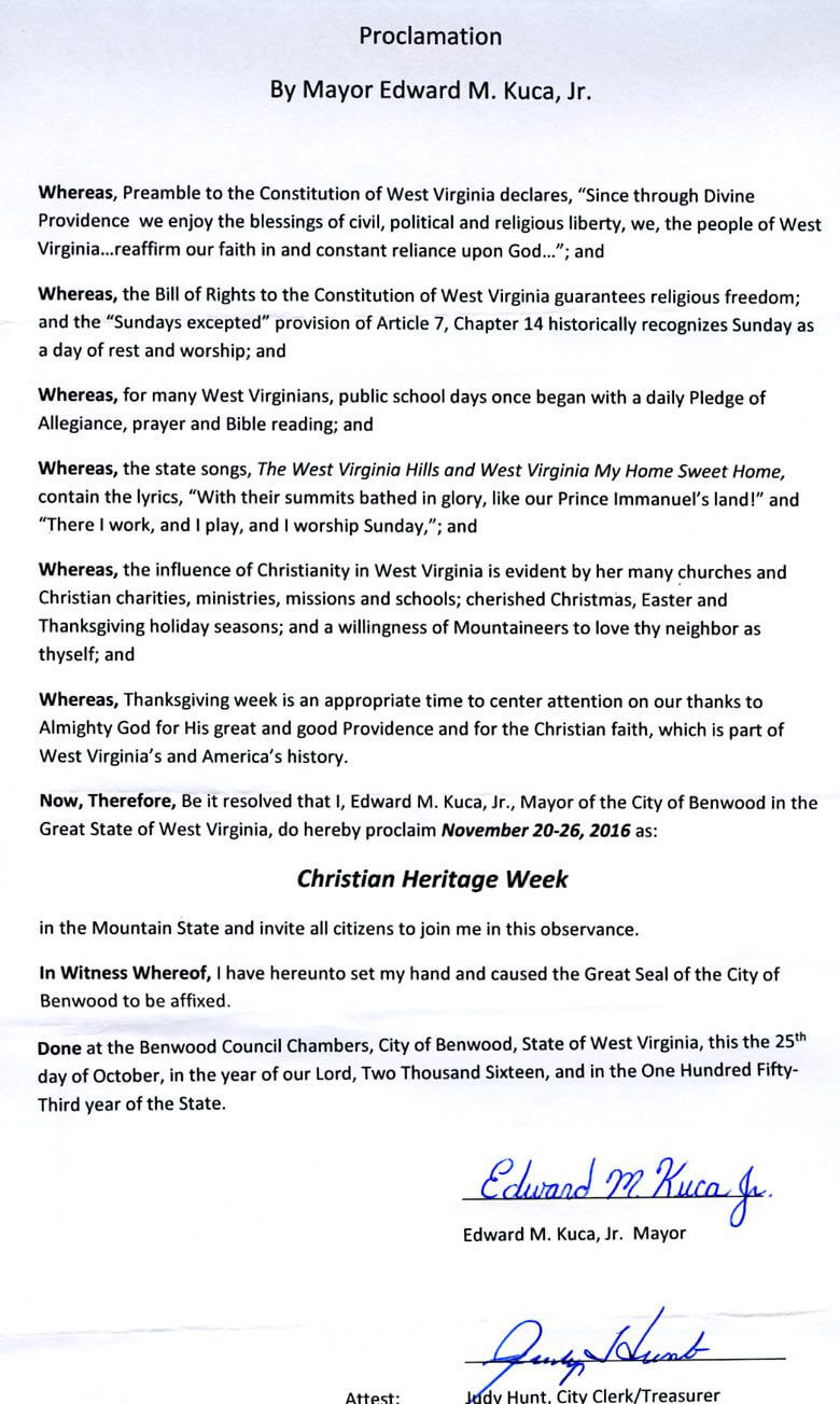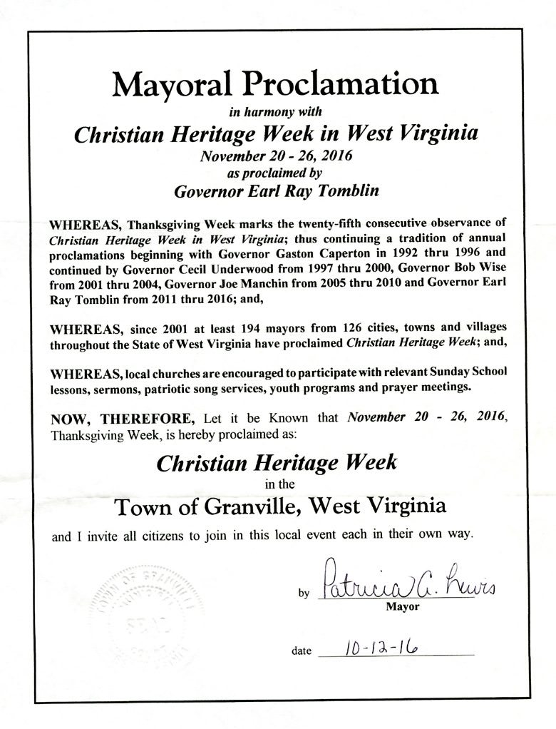 WHEREAS, since 2001at least 194 mayors from 126 cities, towns and villages throughout the State of West Virginia have proclaimed Christian Heritage Week; and,