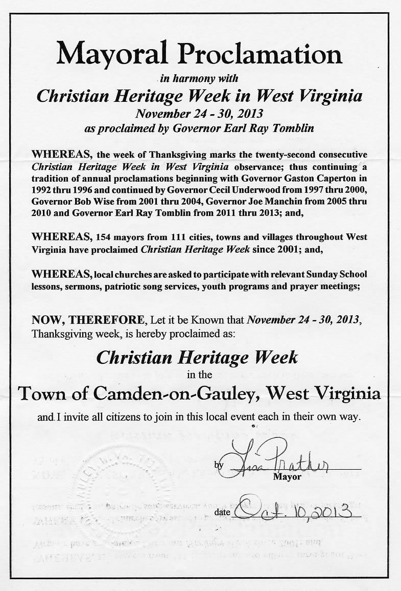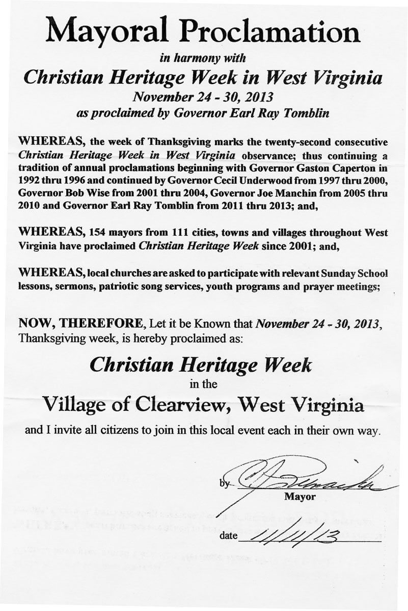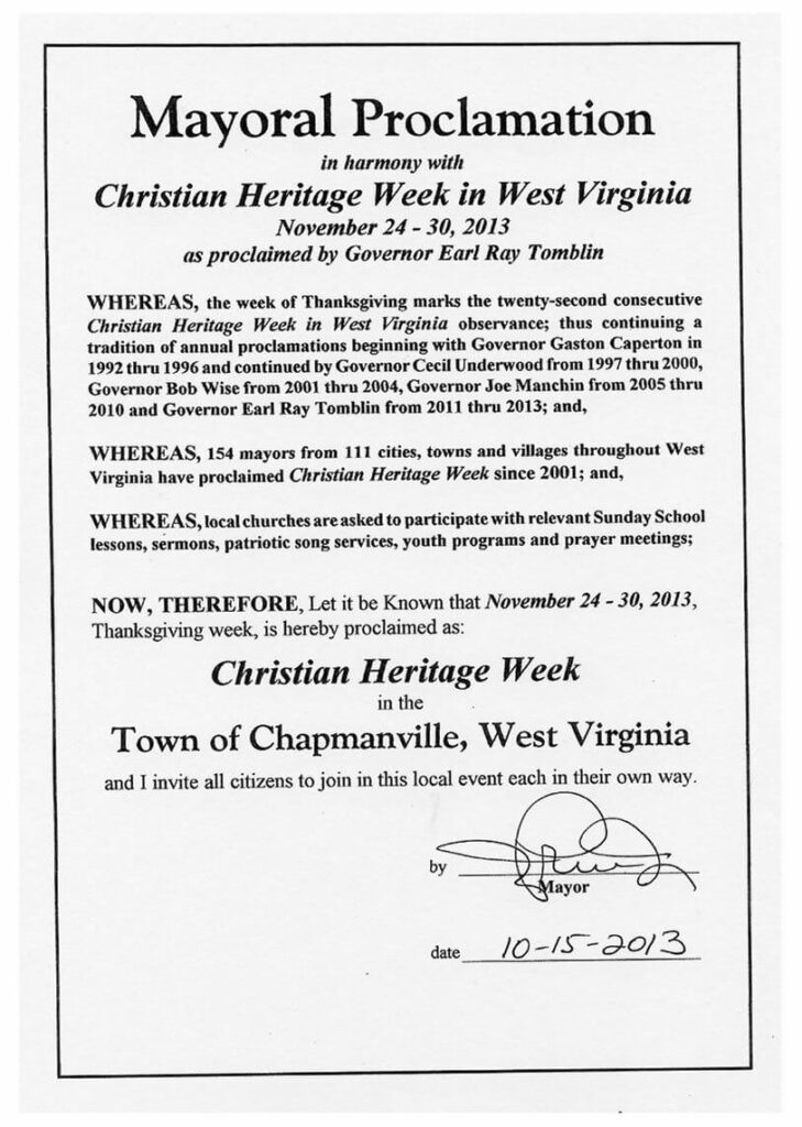 WHEREAS, 154 mayors from 111 cities, towns and villages throughout West Virginia have proclaimed Christian Heritage Week since 2001; and,
