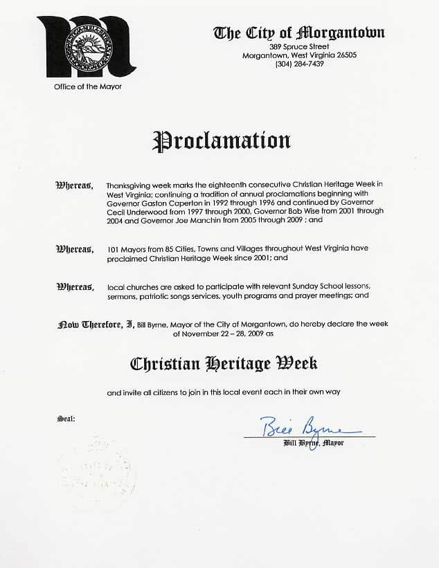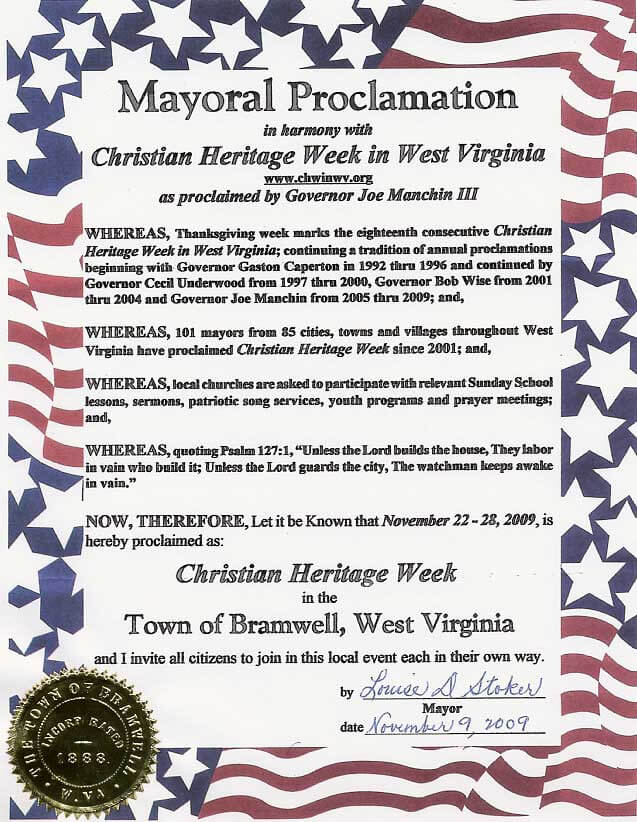 WHEREAS, Thanksgiving week marks the eighteenth consecutive Christian Heritage Week in West Virginia; continuing a tradition of annual proclamations beginning with Governor Gaston Caperton in 1992 thru 1996 and continued by Governor Cecil Underwood from 1997 thru 2000, Governor Bob Wise from 2001 thru 2004 and Governor Joe Manchin from 2005 thru 2009; and,