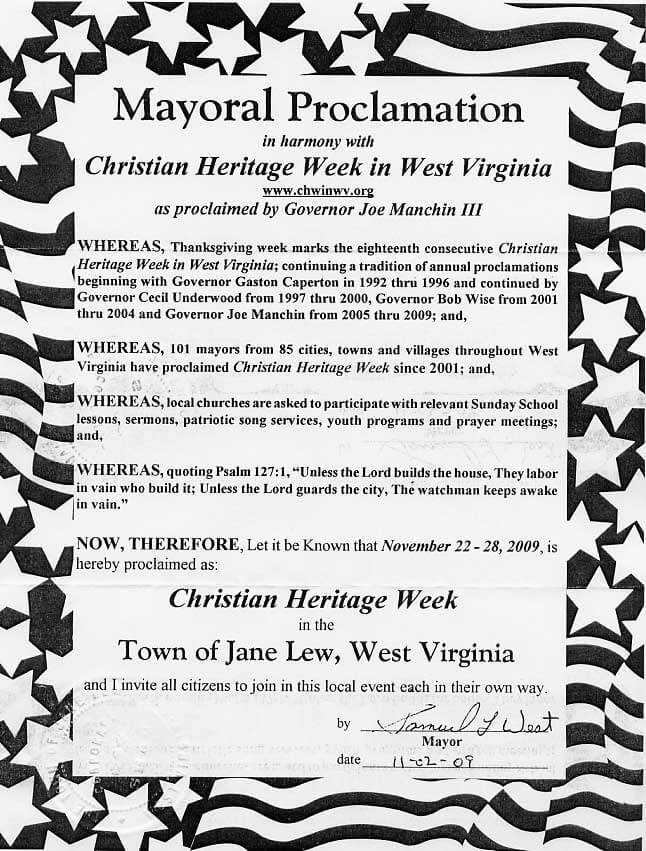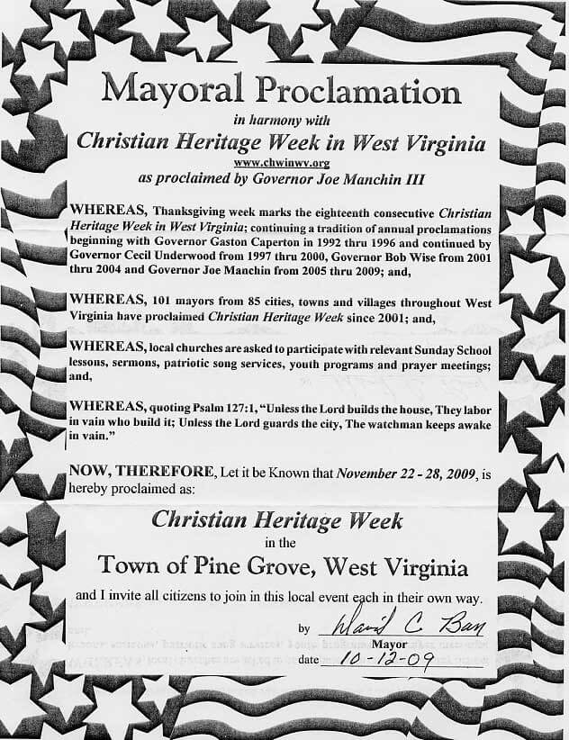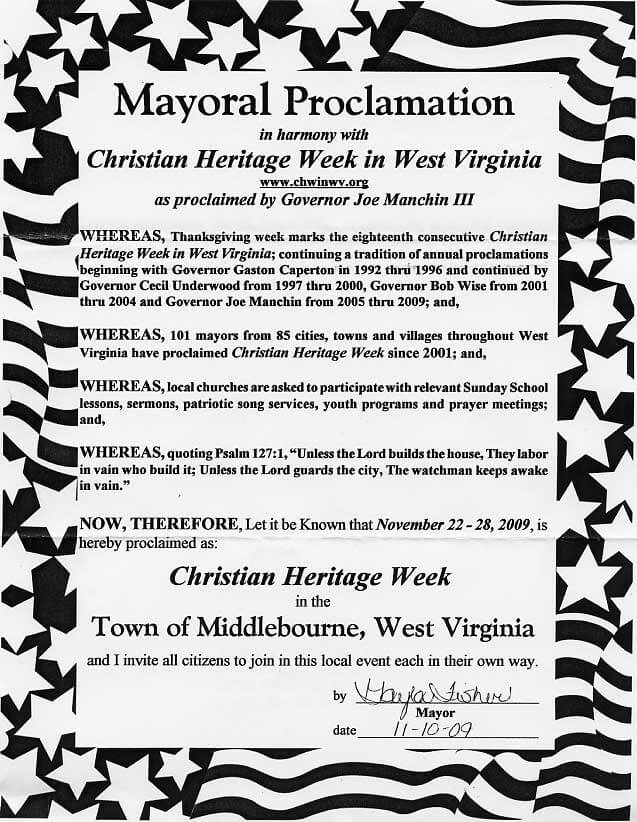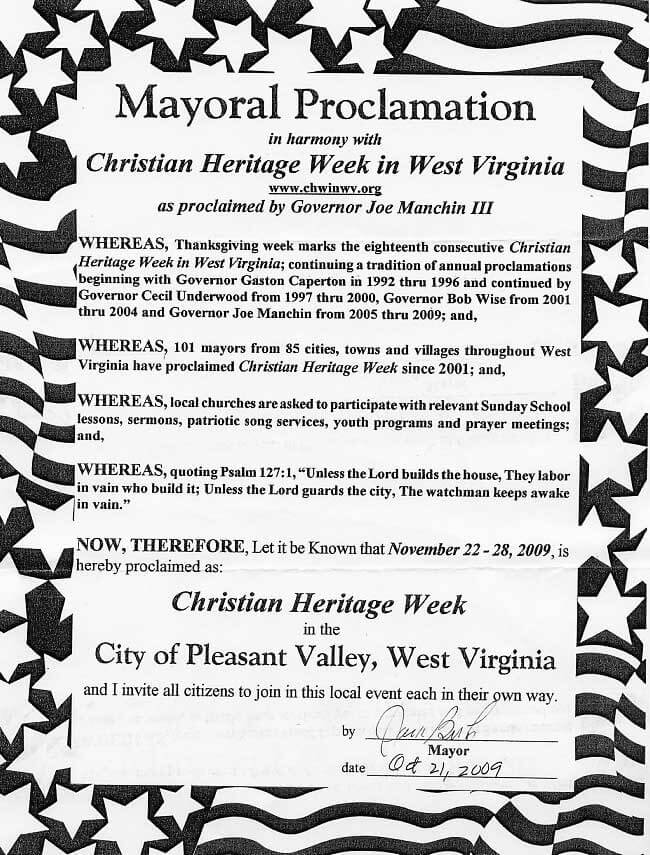 WHEREAS, 101 mayors from 85 cities, towns and villages throughout West Virginia have proclaimed Christian Heritage Week since 2001; and,