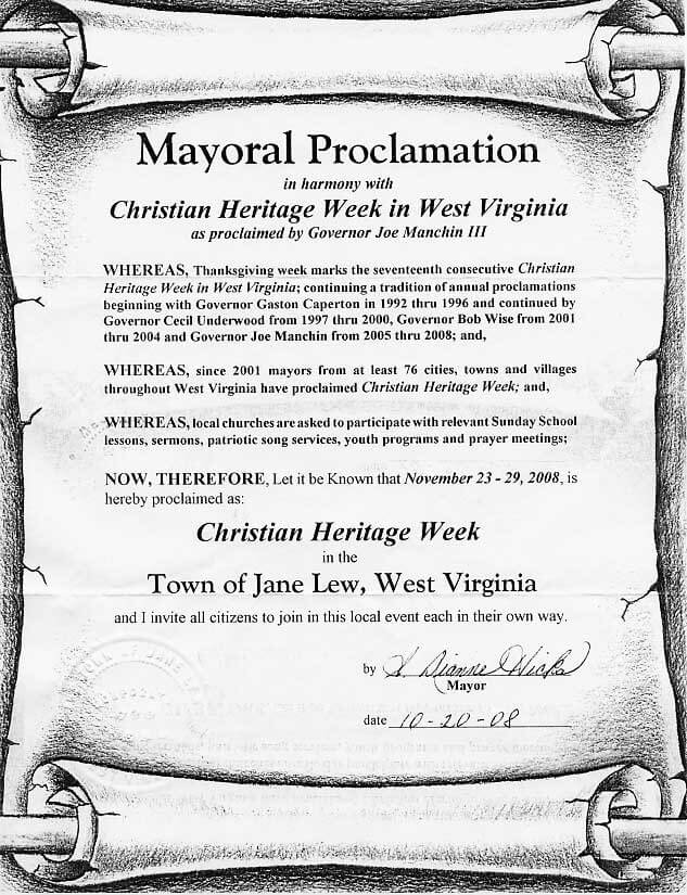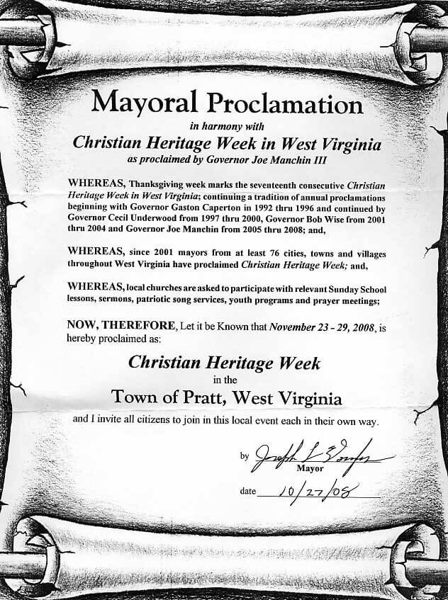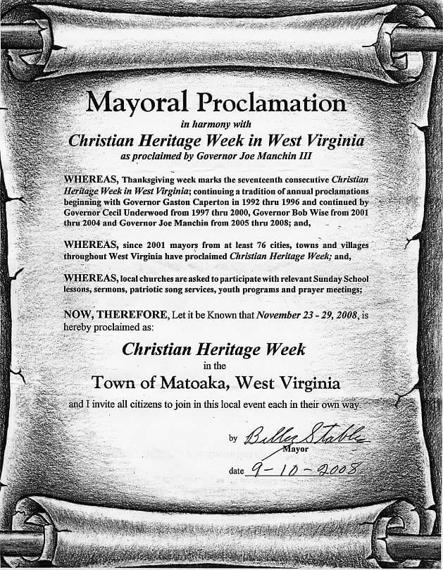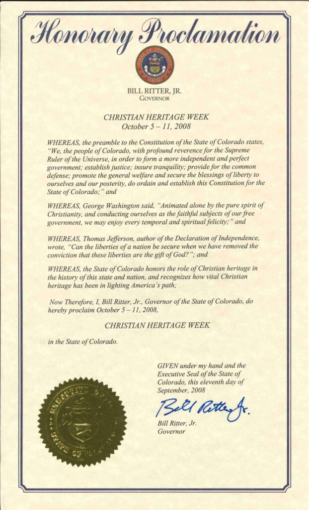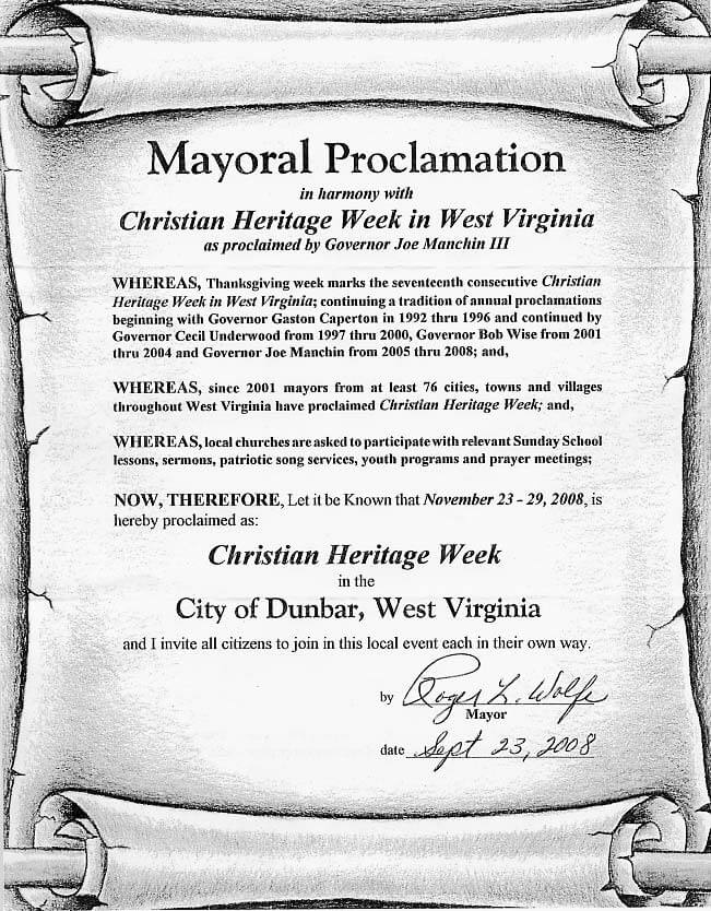 WHEREAS, COMMEMORATING AMERICA’S CHRISTIAN HERITAGE PROVIDES AN OPPORTUNITY FOR THOSE CHOOSING TO PARTICIPATE TO THANK GOD FOR HIS “BLESSINGS OF LIBERTY”, TO ASK HIS HELP TO ‘INSURE DOMESTIC TRANQUILITY’”, AND TO RECOGNIZE OUR NATIONAL NEED AND “UNALIENABLE RIGHTS”, IN REAFFIRMING OUR “RELIANCE OF THE PROTECTION OF DIVINE PROVIDENCE” FOR KEEPING OUR FAMILIES SECURE, COMMUNITIES SAFE AND AMERICA A “FREE AND INDEPENDENT” “ONE NATION UNDER GOD,”: