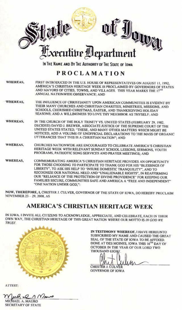 IN IOWA, I INVITE ALL CITIZENS TO ACKNOWLEDGE, APPRECIATE, AND CELEBRATE, EACH IN THEIR OWN WAY, THE CHRISTIAN HERITAGE OF THIS GREAT NATION WHERE OUR MOTTO IS IN GOD WE TRUST.