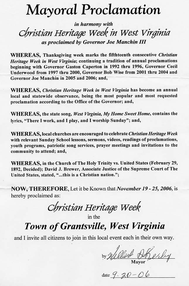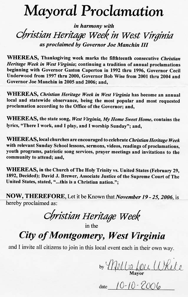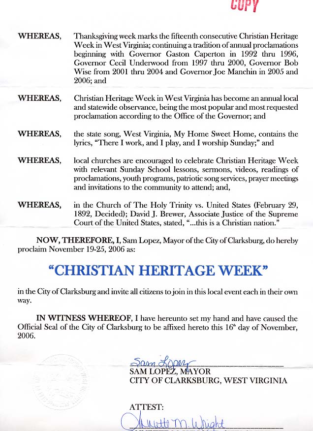 WHEREAS, Thanksgiving week marks the fifteenth consecutive Christian Heritage Week in West Virginia; continuing a tradition of annual proclamations beginning with Governor Gaston Caperton in 1992 thru 1996, Governor Cecil Underwood from 1997 thru 2000, Governor Bob Wise from 2001 thru 2004 and Governor Joe Manchin in 2005 and 2006; and,
