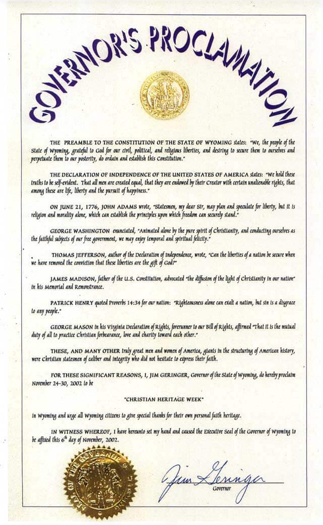 NOW, THEREFORE, I, Jeb Bush, Governor of the State of Florida, do hereby extend greetings and best wishes to all observing November 23-29, 2003, as Christian Heritage Week.