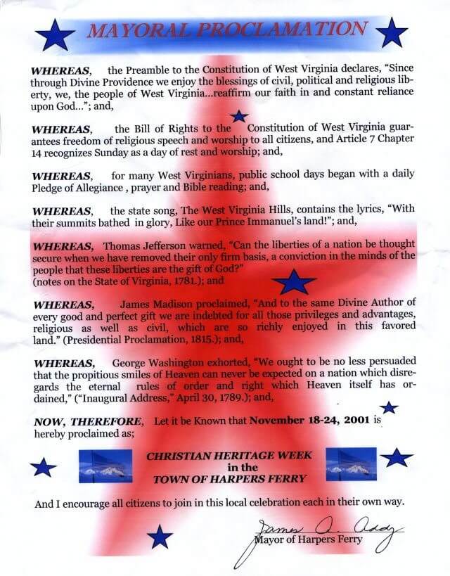 WHEREAS John Adams wrote, “The general principles on which the fathers achieved independence were…the general principles of Christianity.” (Letter to Thomas Jefferson, June 28, 1813.); and,