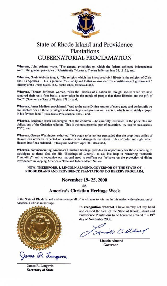 NOW, THEREFORE, I, LINCOLN ALMOND, GOVERNOR OF THE STATE OF RHODE ISLAND AND PROVIDENCE PLANTATIONS, DO HEREBY PROCLAIM, November 19-25, 2000 as America’s Christian Heritage Week in the State of Rhode Island and encourage all of its citizens to join me in this nationwide celebration of America’s Christian heritage.