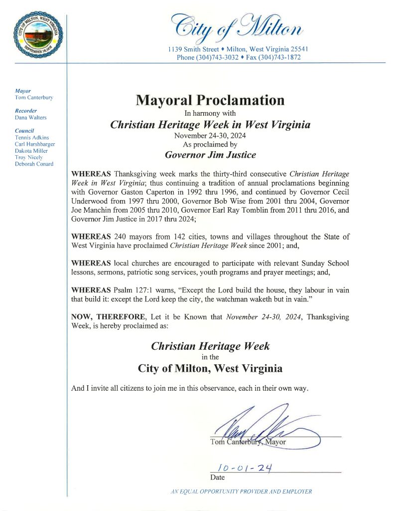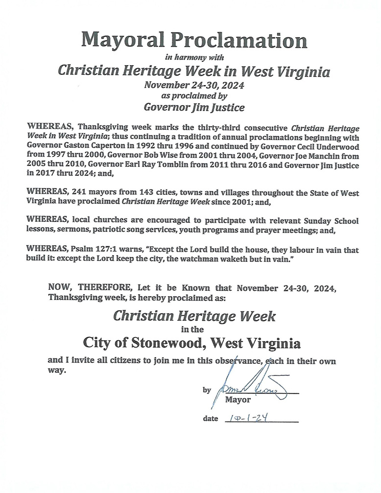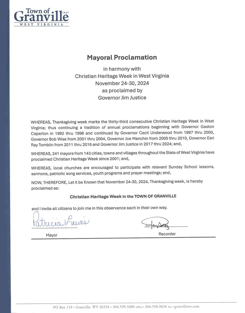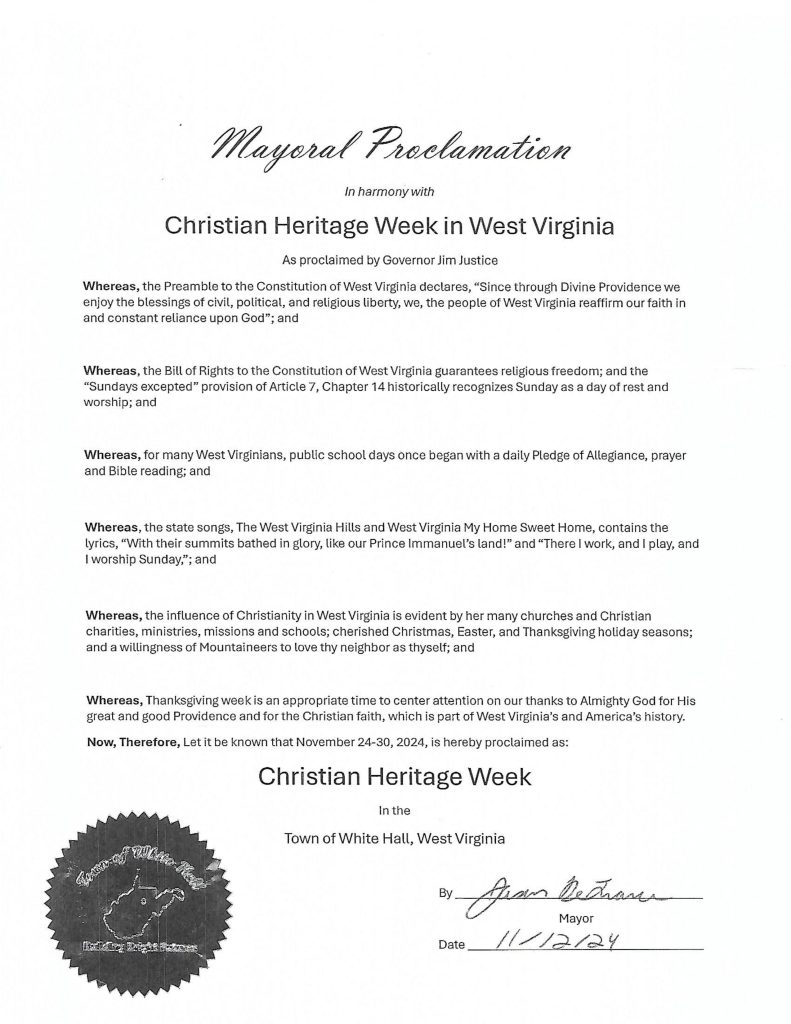 Whereas, Thanksgiving week is an appropriate time to center attention on our thanks to Almighty God for His great and good Providence and for the Christian faith, which is part of Wast Virginia’s and America’s history.