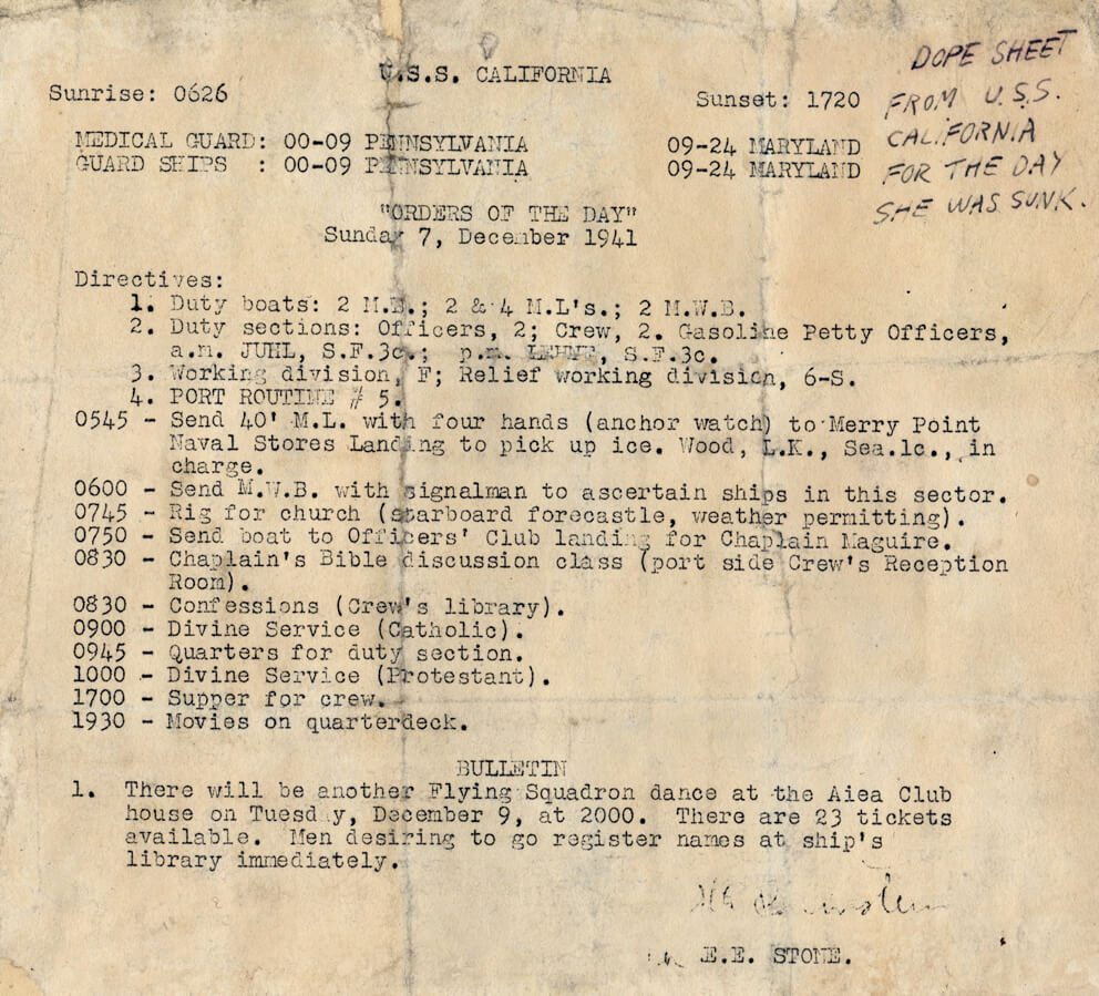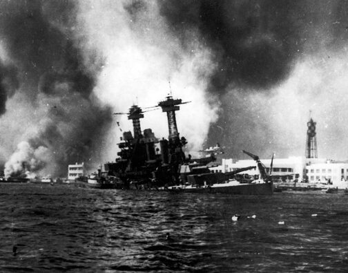 One story from this day at Pearl Harbor relates to the USS California (a battleship, pictured on the right in the aftermath of the attack). During the attack, it took three direct hits — two torpedoes and one bomb, killing about 100. It caught fire and the remainder of the crew made their way to shore before the