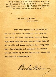 Also, throughout American history, Bibles have been distributed to soldiers going into war and sometimes these Bibles would include messages from leaders on the importance of Bible reading. For example, a letter from President Woodrow Wilson was used in a WWI era Bible (pictured here from a Bible in WallBuilders’ Collection):