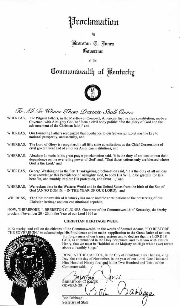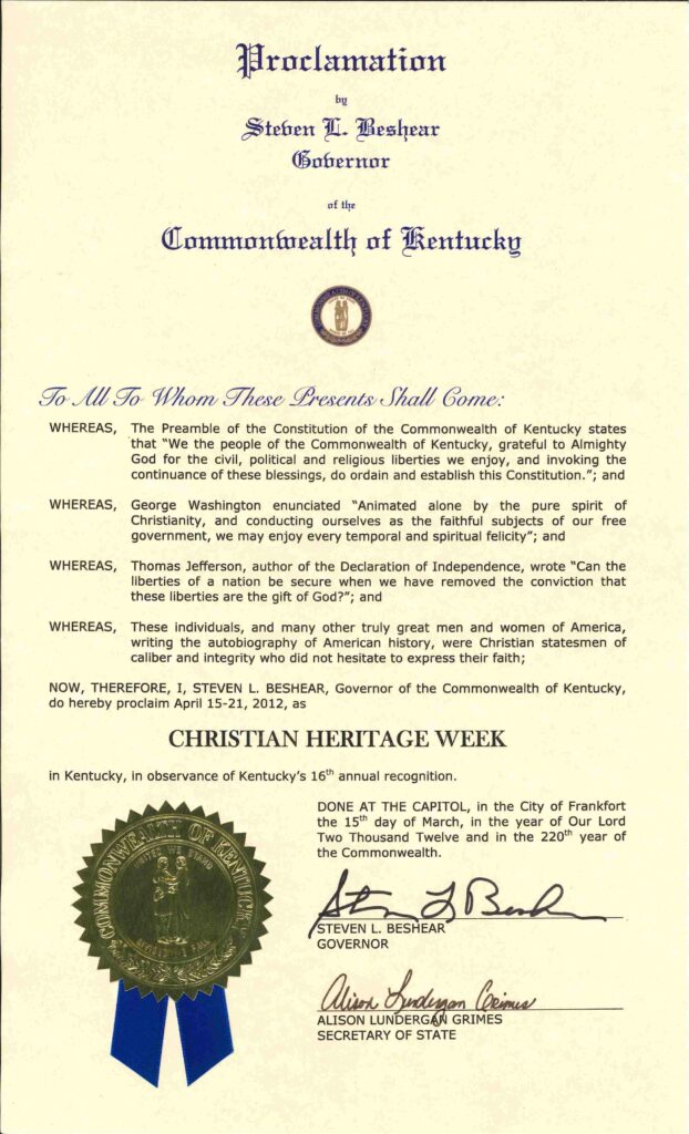 WHEREAS, The Preamble to the Constitution of the Commonwealth of Kentucky states that, “We the people of the Commonwealth of Kentucky, grateful to Almighty God for the civil, political and religious liberties we enjoy, and invoking the continuance of these blessings, do ordain and establish this Constitution.”; and