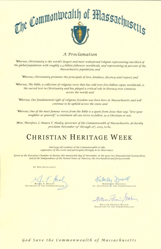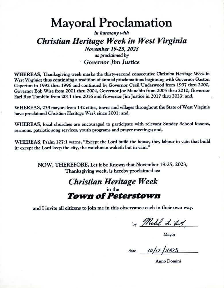 WHEREAS, Thanksgiving week marks the thirty-third consecutive Christian Heritage Week in West Virginia; thus continuing a tradition of annual proclamations beginning with Governor Gaston Caperton in 1992 thru 1996 and continued by Governor Cecil Underwood from 1997 thru 2000, Governor Bob Wise from 2001 thru 2004, Governor Joe Manchin from 2005 thru 2010, Governor Earl Ray Tomblin from 2011 thru 2016 and Governor Jim Justice in 2017 thru 2024;