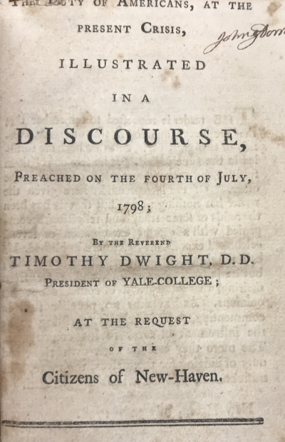 Timothy Dwight (1752-1817) graduated from Yale in 1769. He was principal of the New Haven grammar school (1769-1771) and a tutor at Yale (1771-1777). A lack of chaplains during the Revolutionary War led him to become a preacher and he served as a chaplain in a Connecticut brigade. Dwight served as preacher in neighboring churches in Northampton, MA (1778-1782) and in Fairfield, CT (1783). He also served as president of Yale College (1795-1817).