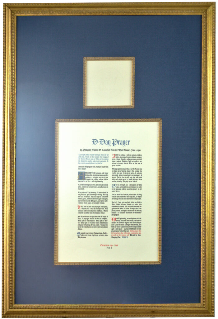 In 1944, President Franklin D. Roosevelt printed copies of his famous D-Day speech to give to give as gifts. Below is a picture of that 1944 Christmas gift and the transcription of the prayer Roosevelt prayed on D-Day (June 6, 1944).