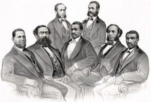 For example, at the national level, in 1871, Robert Brown Elliott was elected to the US House of Representatives — one of the first blacks elected to national office (the picture on the left shows the first seven blacks elected to Congress, including Elliott; all seven were Republicans). Originally from England, Elliott came to the U.S. in 1867 and quickly became influential in South Carolina, being one of 78 black delegates to the 1868 state constitutional convention, and placing second in the vote to be speaker of the state house.