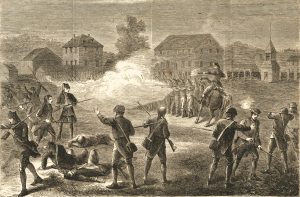 13 Deposition #17, James Barrett, April 23, 1775, American History Central (specifies 300–400 militia present at North Bridge in Concord); Bancroft, History (1864), VII:290, 299. “Lt. Col. Francis Smith to Governor Thomas Gage, April 22, 1775,” Gilder Lehrman provides a British perspective as he states: “On our leaving Concord to return to Boston they began to fire on us from behind the walls, ditches, trees etc., which as we marched increased to a very great degree and continued without the intermission of five minutes altogether for I believe upwards of eighteen miles, so that I can’t think but it must have been a preconcerted scheme in them to attack the King’s troops the first favourable opportunity that offered.”