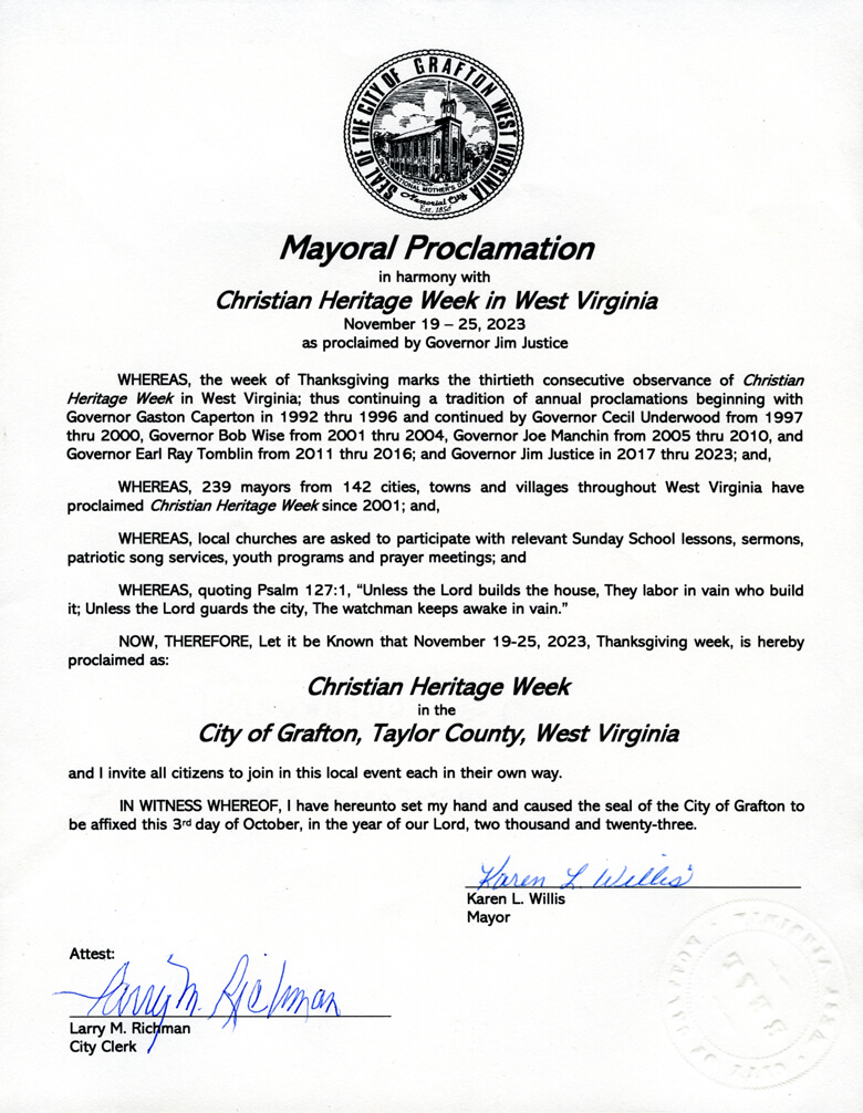 WHEREAS, the week of Thanksgiving marks the thirtieth consecutive observance of Christian Heritage Week in West Virginia; thus continuing a tradition of annual proclamations beginning with Governor Gaston Caperton in 1992 thru 1996 and continued by Governor Cecil Underwood from 1997 thru 2000, Governor Bob Wise from 2001 thru 2004, Governor Joe Manchin from 2005 thru 2010, and Governor Earl Ray Tomblin from 2011 thru 2016; and Governor Jim Justice in 2017 thru 2023; and,