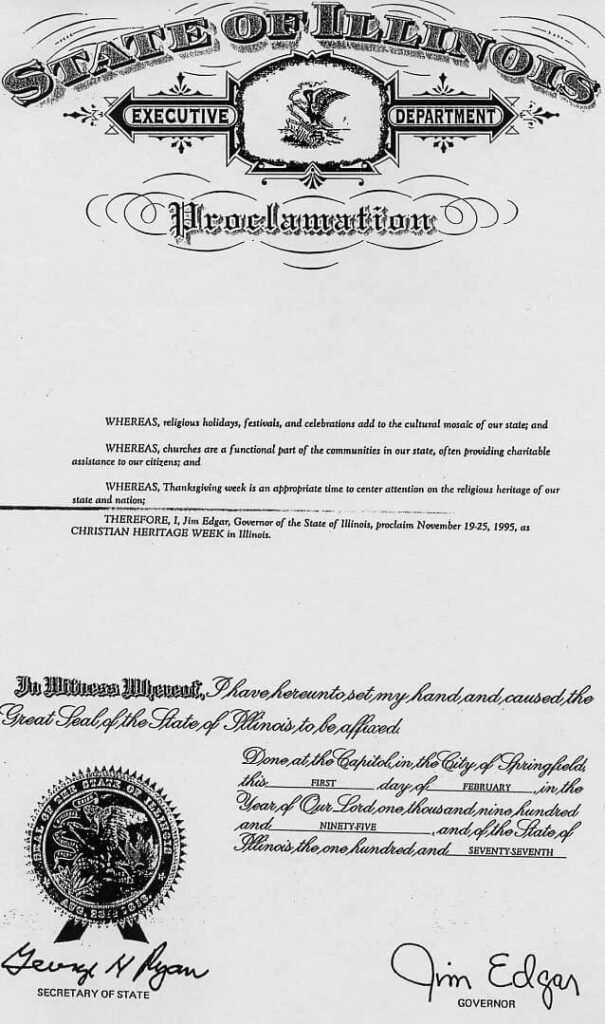 THEREFORE, I, Jim Edgar, Governor of the State of Illinois, proclaim November 19-25, 1995, as CHRISTIAN HERITAGE WEEK in Illinois.