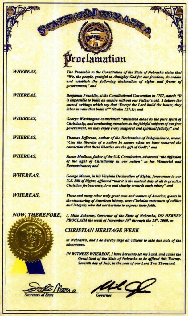 NOW, THEREFORE, I, Mike Johanns, Governor of the State of Nebraska, DO HEREBY PROCLAIM the week of November 19th through the 25th, 2000, as CHRISTIAN HERITAGE WEEK in Nebraska, and I do hereby urge all citizens to take due note of the observance.