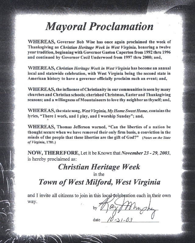 WHEREAS, Christian Heritage Week in West Virginia has become an annual local and statewide celebration, with West Virginia being the second state in American history to have a governor officially proclaim such an event; and,
