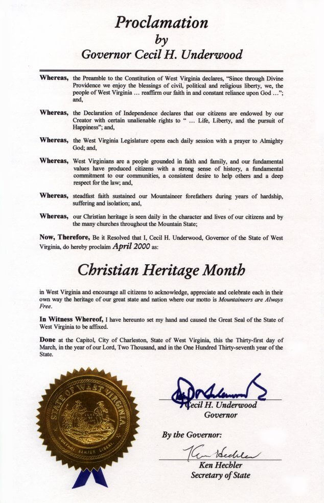 Now, Therefore, Be it Resolved that I, Cecil H. Underwood, Governor of the State of West Virginia, do hereby proclaim April 2000, as Christian Heritage Month in West Virginia and encourage all citizens to acknowledge, appreciate and celebrate each in their own way the heritage of our great state and nation where our motto is Mountaineers are Always Free.