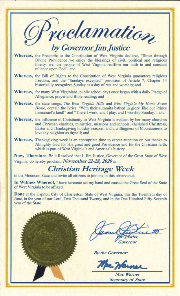 Whereas, Thanksgiving week is an appropriate time to center attention on our thanks to Almighty God for His great and good Providence and for the Christian faith, which is part of West Virginia’s and America’s history.