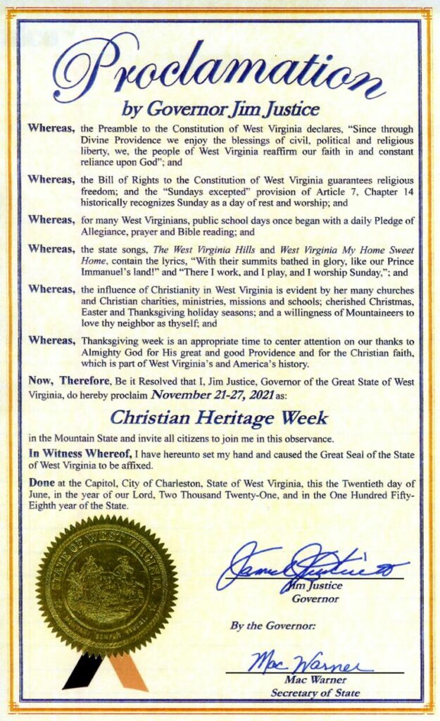 Whereas, Thanksgiving week is an appropriate time to center attention on our thanks to Almighty God for His great and good Providence and for the Christian faith, which is part of West Virginia’s and America’s history.