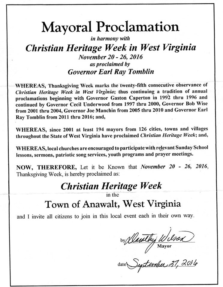 WHEREAS, since 2001 at least 194 mayors from 126 cities, towns and villages throughout the State of West Virginia have proclaimed Christian Heritage Week; and,
