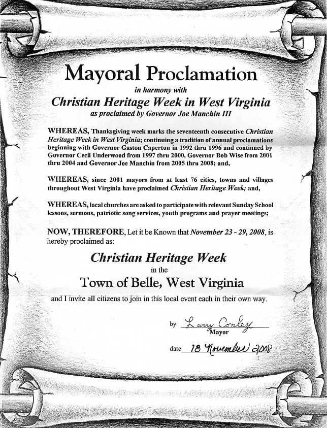 WHEREAS, since 2001 mayors from at least 76 cities, towns and villages throughout West Virginia have proclaimed Christian Heritage Week; and,