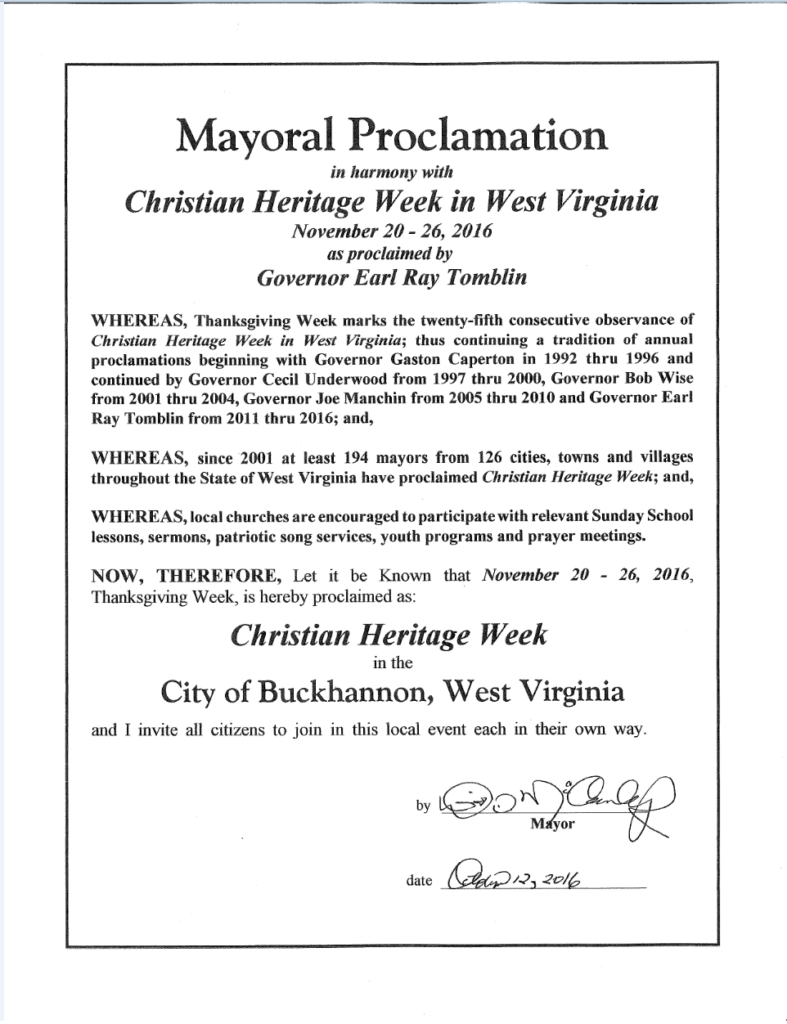 Now, Therefore, Be it Resolved that I, Earl Ray Tomblin, Governor of the Great State of West Virginia, do hereby proclaim November 20-26, 2016 as Christian Heritage Week in the Mountain State and invite all citizens to join me in this observance.