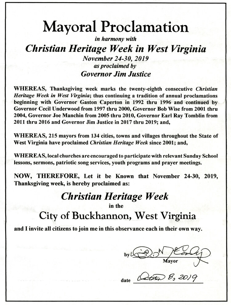 Now, Therefore, Be it Resolved that I, Earl Ray Tomblin, Governor of the Great State of West Virginia, do hereby proclaim November 20-26, 2016 as Christian Heritage Week in the Mountain State and invite all citizens to join me in this observance.