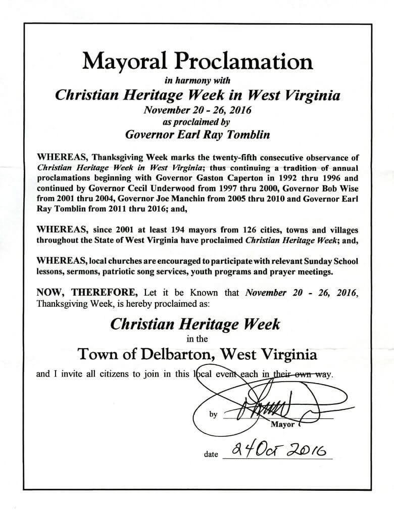 WHEREAS, since 2001 at least 194 mayors from 126 cities, towns and villages throughout the State of West Virginia have proclaimed Christian Heritage Week; and,