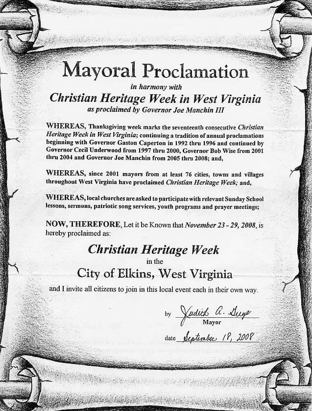 WHEREAS, since 2001mayors from at least 76 cities, towns and villages throughout West Virginia have proclaimed Christian Heritage Week; and,
