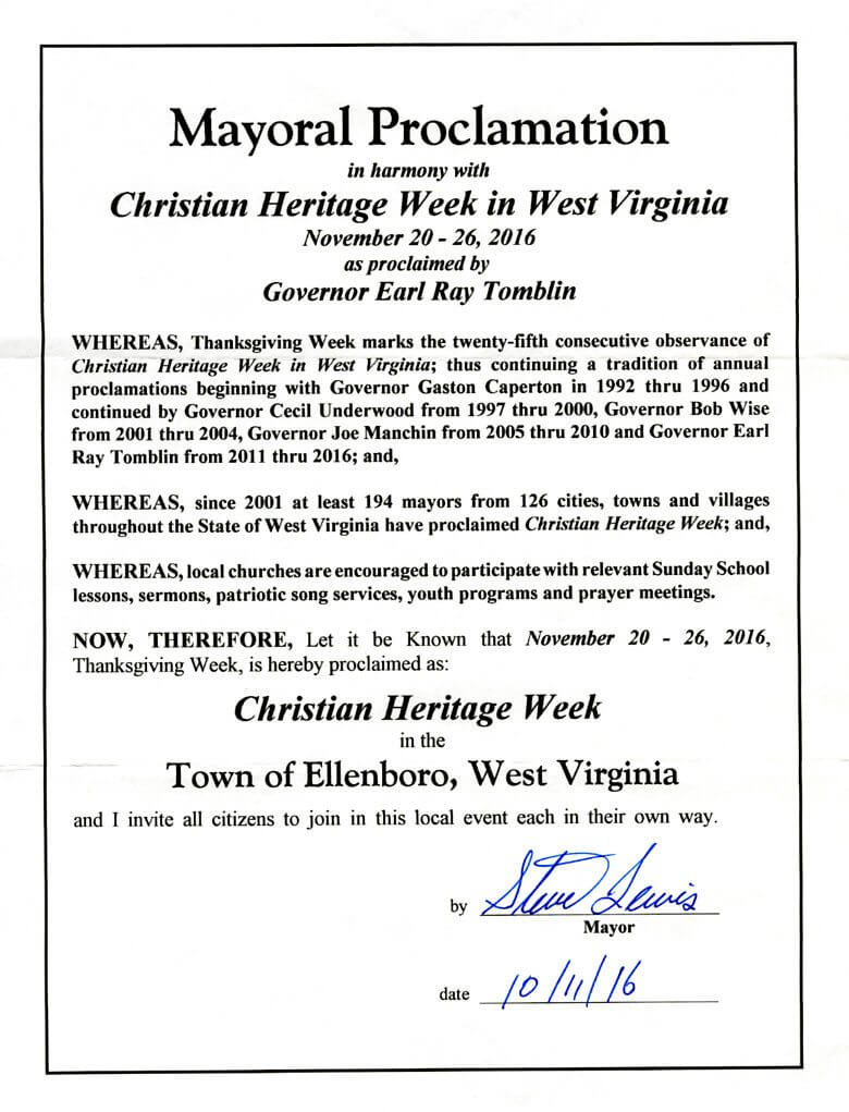 WHEREAS, since 2001at least 194 mayors from 126 cities, towns and villages throughout the State of West Virginia have proclaimed Christian Heritage Week; and,