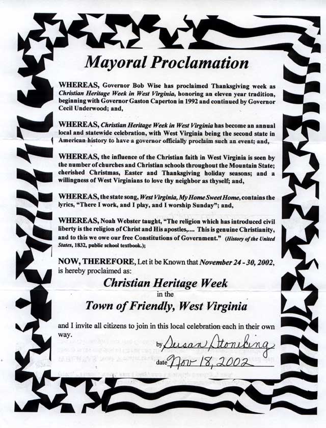 in the Town of Friendly, West Virginia and I invite all citizens to join in this local celebration each in their own way.