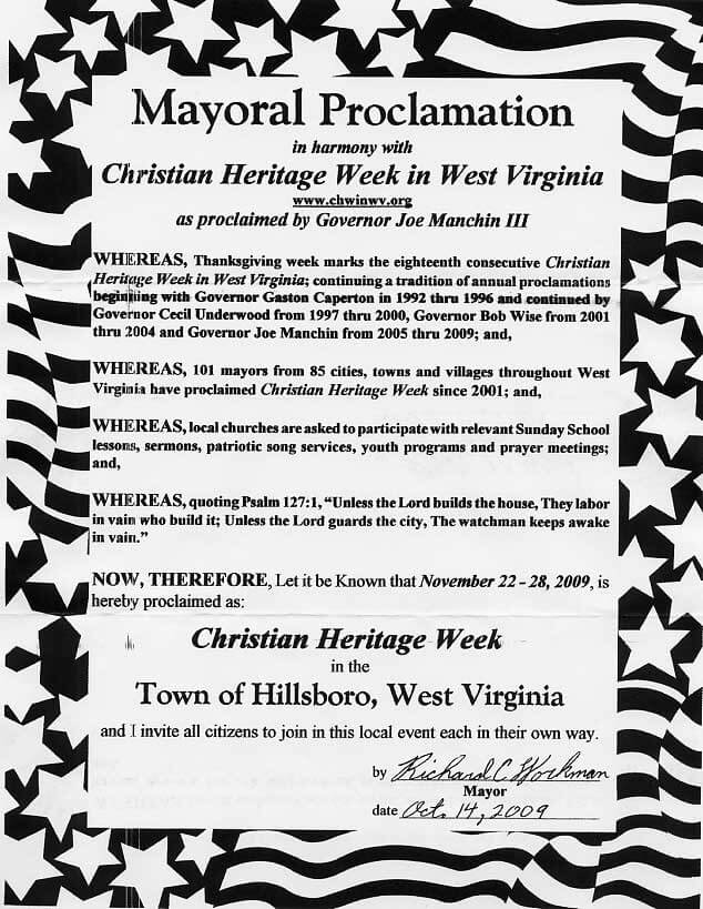 WHEREAS, 101 mayors from 85 cities, towns and villages throughout West Virginia have proclaimed Christian Heritage Week since 2001; and,