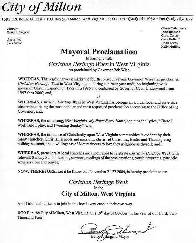 WHEREAS, Christian Heritage Week in West Virginia has become an annual local and statewide observance; being the most popular and most requested proclamation according to the Office of the Governor; and,