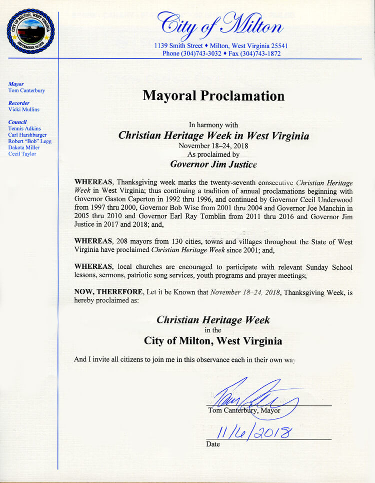 in the City of Milton, West Virginia and I invite all citizens to join me in this observance each in their own way.