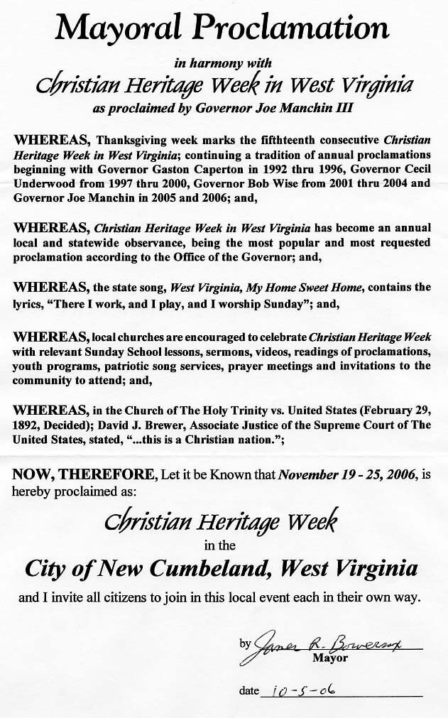 WHEREAS, Thanksgiving week marks the fifteenth consecutive Christian Heritage Week in West Virginia; continuing a tradition of annual proclamations beginning with