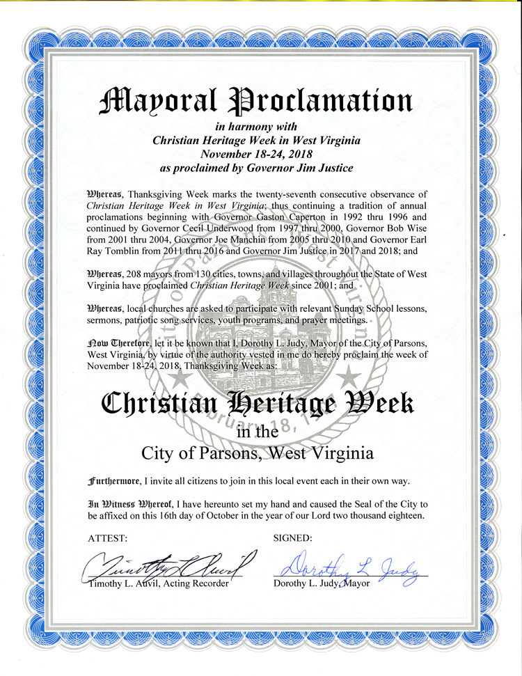 Now, Therefore, let it be known that I, Dorothy L. Judy, Mayor of the City of Parsons, West Virginia, by virtue of the authority vested in me do hereby proclaim te week of November 18-24, 2018, Thanksgiving Week as: