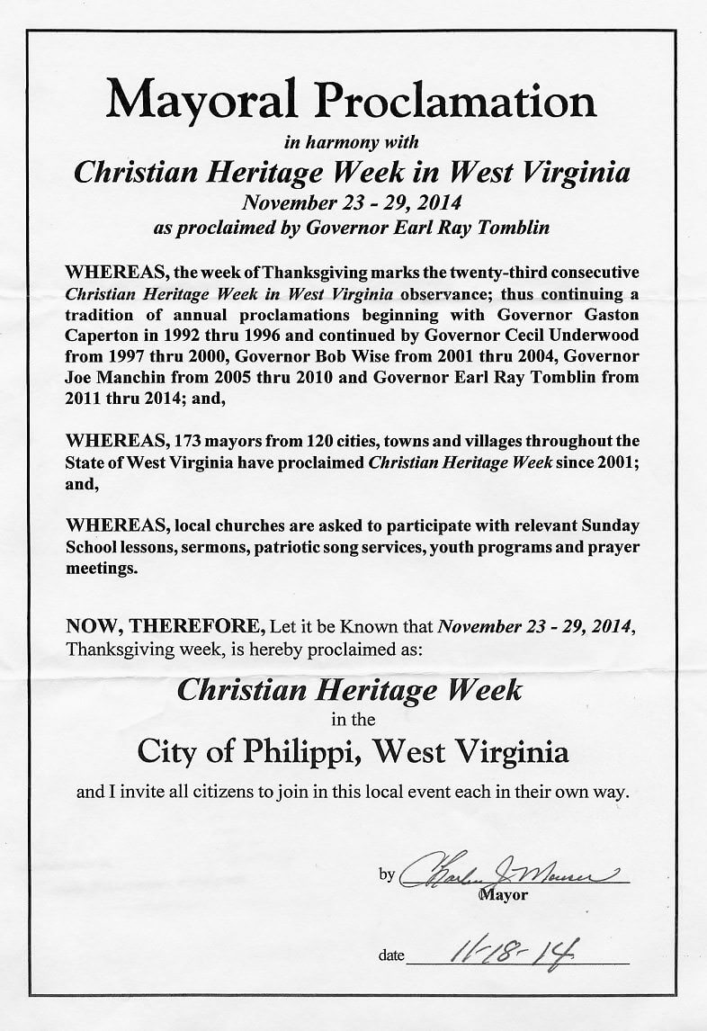 WHEREAS, the week of Thanksgiving marks the twenty-third consecutive Christian Heritage Week in West Virginia observance; thus continuing a tradition of annual proclamations beginning with Governor Gaston Caperton in 1992 thru 1996 and continued by Governor Cecil Underwood from 1997 thru 2000, Governor Bob Wise from 2001 thru 2004, Governor Joe Manchin from 2005 thru 2010 and Governor Earl Ray Tomblin from 2011 thru 2014; and,