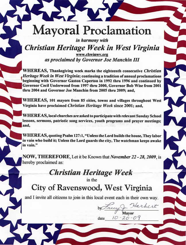 WHEREAS, 101 mayors from 85 cities, towns and villages throughout West Virginia have proclaimed Christian Heritage Week since 2001; and,