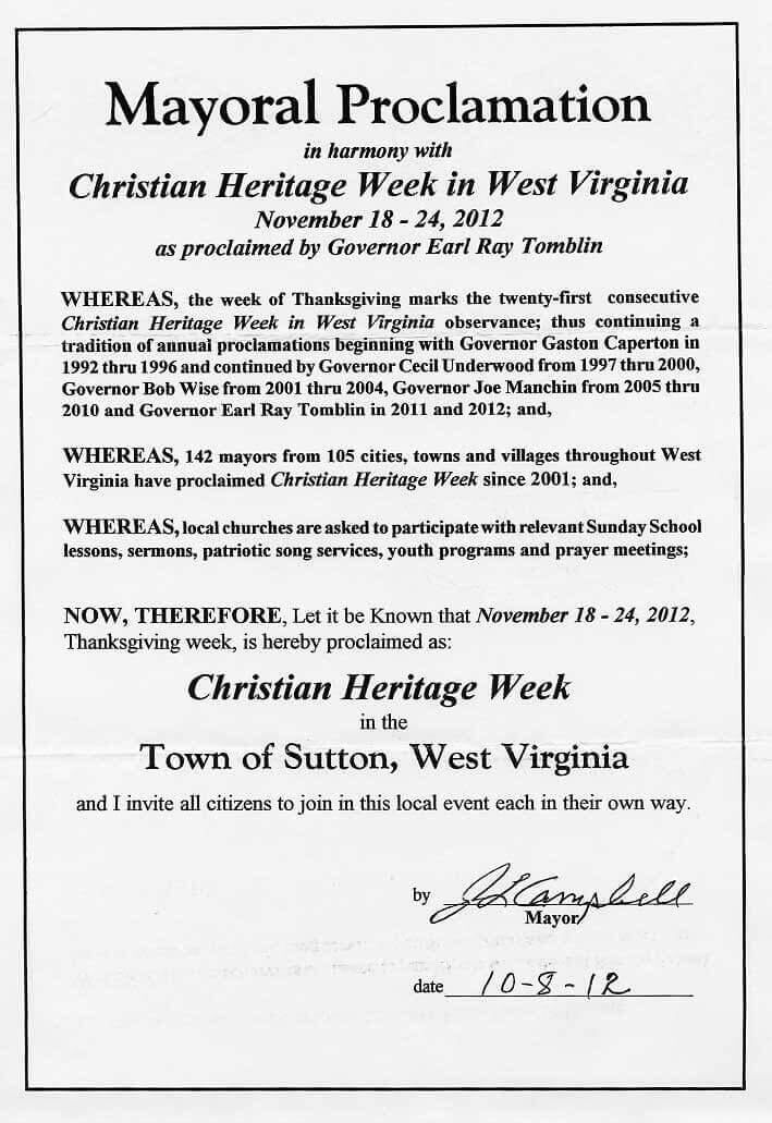 WHEREAS, the week of Thanksgiving marks the twenty-first consecutive Christian Heritage Week in West Virginia observance; thus continuing a tradition of annual proclamations beginning with Governor Gaston Caperton in 1992 thru 1996 and continued by Governor Cecil Underwood from 1997 thru 2000, Governor Bob Wise from 2001 thru 2004, Governor Joe Manchin from 2005 thru 2010 and Governor Earl Ray Tomblin in 2011 and 2012; and,