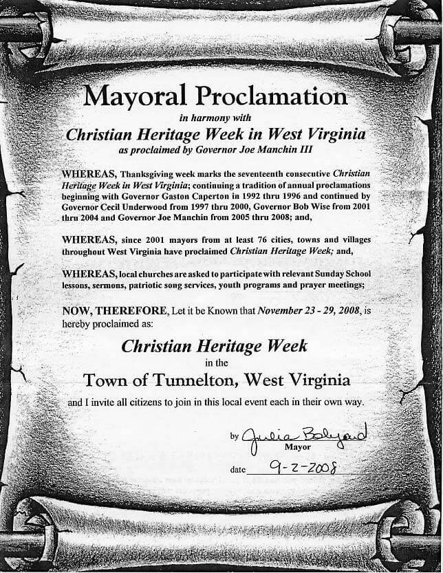WHEREAS, since 2001 mayors from at least 76 cities, towns and villages throughout West Virginia have proclaimed Christian Heritage Week; and,