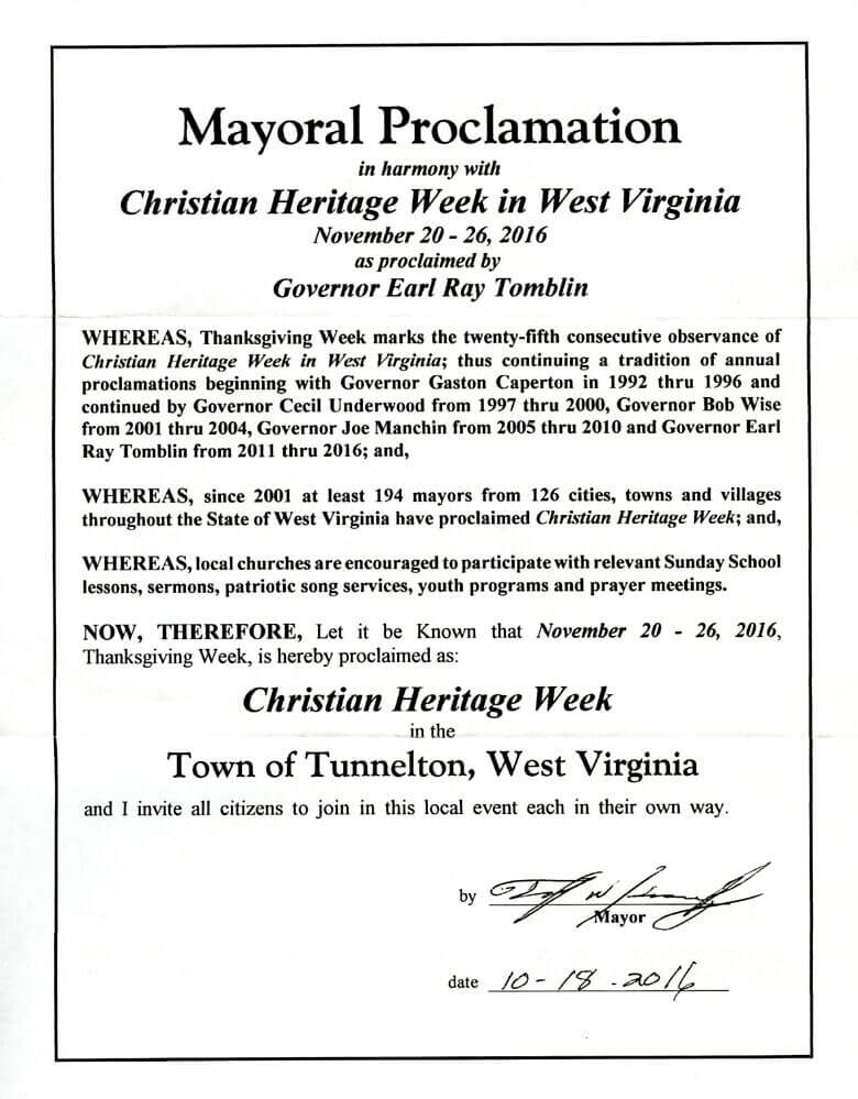 WHEREAS, since 2001at least 194 mayors from 126 cities, towns and villages throughout the State of West Virginia have proclaimed Christian Heritage Week; and,